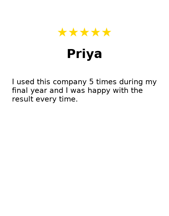 We only work with writers who’ve graduated from a university worldwide and hold a minimum of a 2.1. The majority of our writers also hold postgraduate degrees and have relevant industry experience at BB Digital Services.